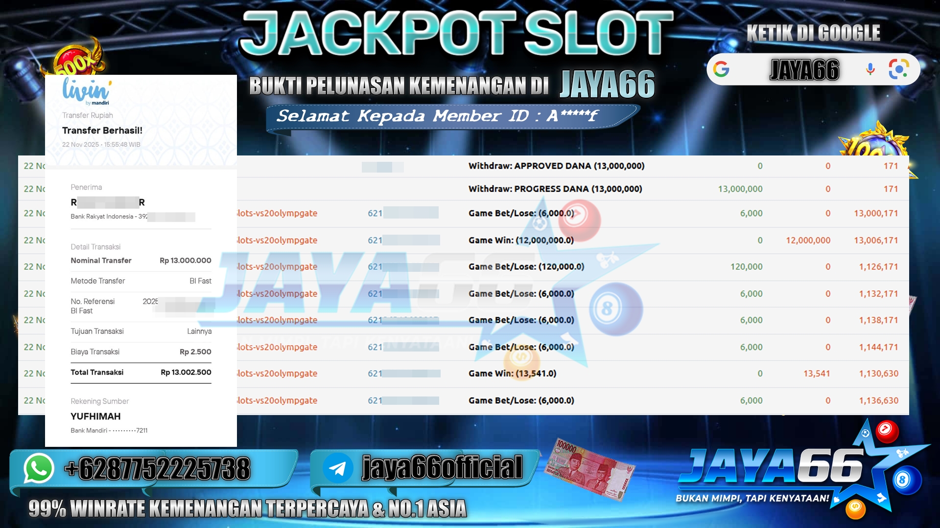 Selamat Kepada Member ID : W********9, Telah berhasil mendapatkan kemenangan besar pada permainan SLOT GATES OFF OLYMPUS , kemenangan Sebesar Rp.30,000,000,- Setelah mengisi form withdraw dengan kurung waktu hanya 3 – 5 menit pihak JAYA66 sudah melakukan transfer kepada pemilik Userid dan dana sudah dapat di cairkan oleh pemenang. Bukti pembayaran yang kami berikan merupakan bukti pembayaran yang SAH / VALID yang langung di dapatkan melaui tanda transfer transaksi dari Bank yang di tuju.