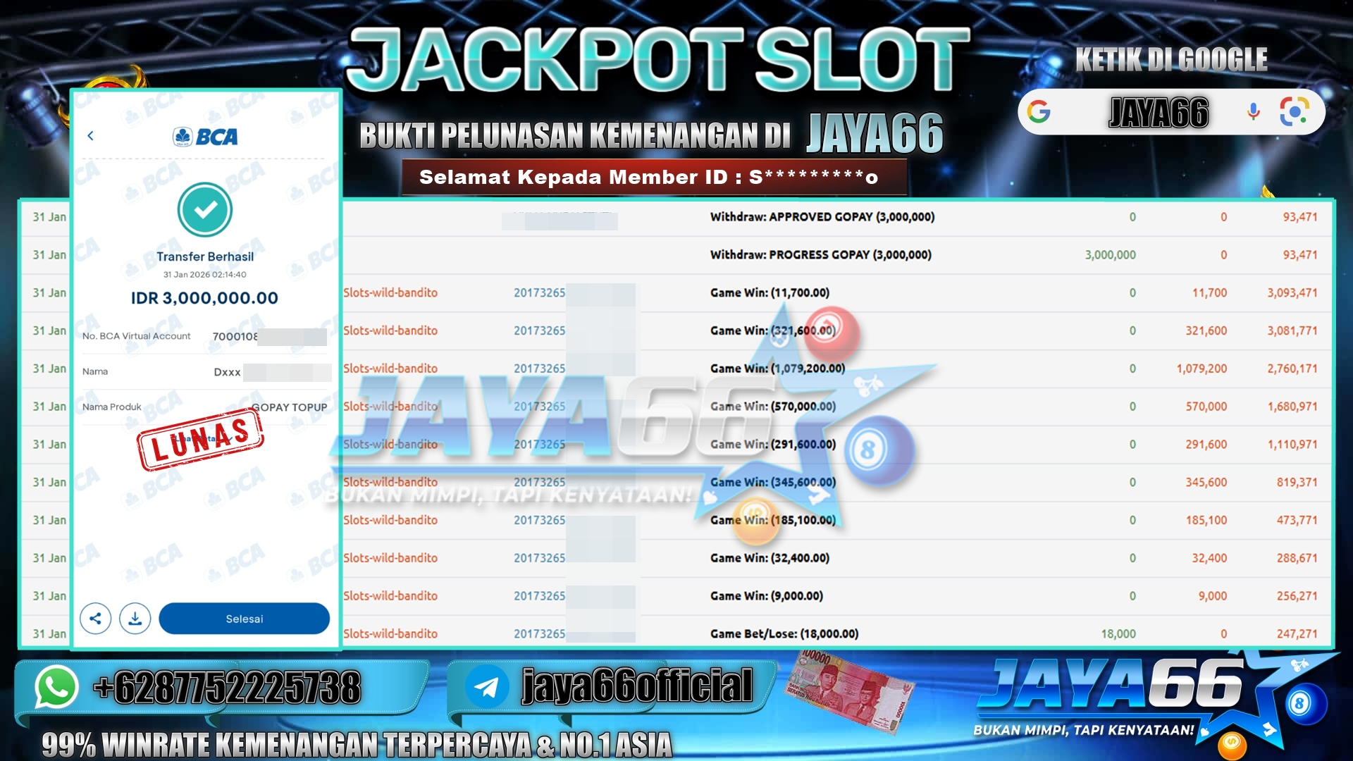 Selamat Kepada Member ID : H****4, Telah berhasil mendapatkan kemenangan besar pada permainan SLOT MAHJONG WAYS 2, kemenangan Sebesar Rp. 2,700,000,- Setelah mengisi form withdraw dengan kurung waktu hanya 3 – 5 menit pihak JAYA66 sudah melakukan transfer kepada pemilik Userid dan dana sudah dapat di cairkan oleh pemenang. Bukti pembayaran yang kami berikan merupakan bukti pembayaran yang SAH / VALID yang langung di dapatkan melaui tanda transfer transaksi dari Bank yang di tuju.