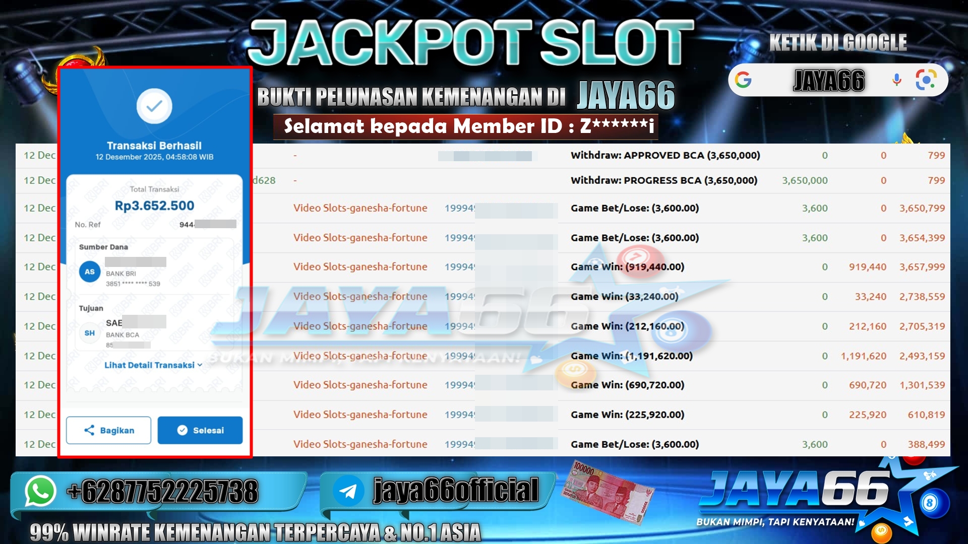 Selamat Kepada Member ID : H*******1, Telah berhasil mendapatkan kemenangan besar pada permainan SLOT MAHJONG WAYS, kemenangan Sebesar Rp. 13,920,000,- Setelah mengisi form withdraw dengan kurung waktu hanya 3 – 5 menit pihak JAYA66 sudah melakukan transfer kepada pemilik Userid dan dana sudah dapat di cairkan oleh pemenang. Bukti pembayaran yang kami berikan merupakan bukti pembayaran yang SAH / VALID yang langung di dapatkan melaui tanda transfer transaksi dari Bank yang di tuju.
