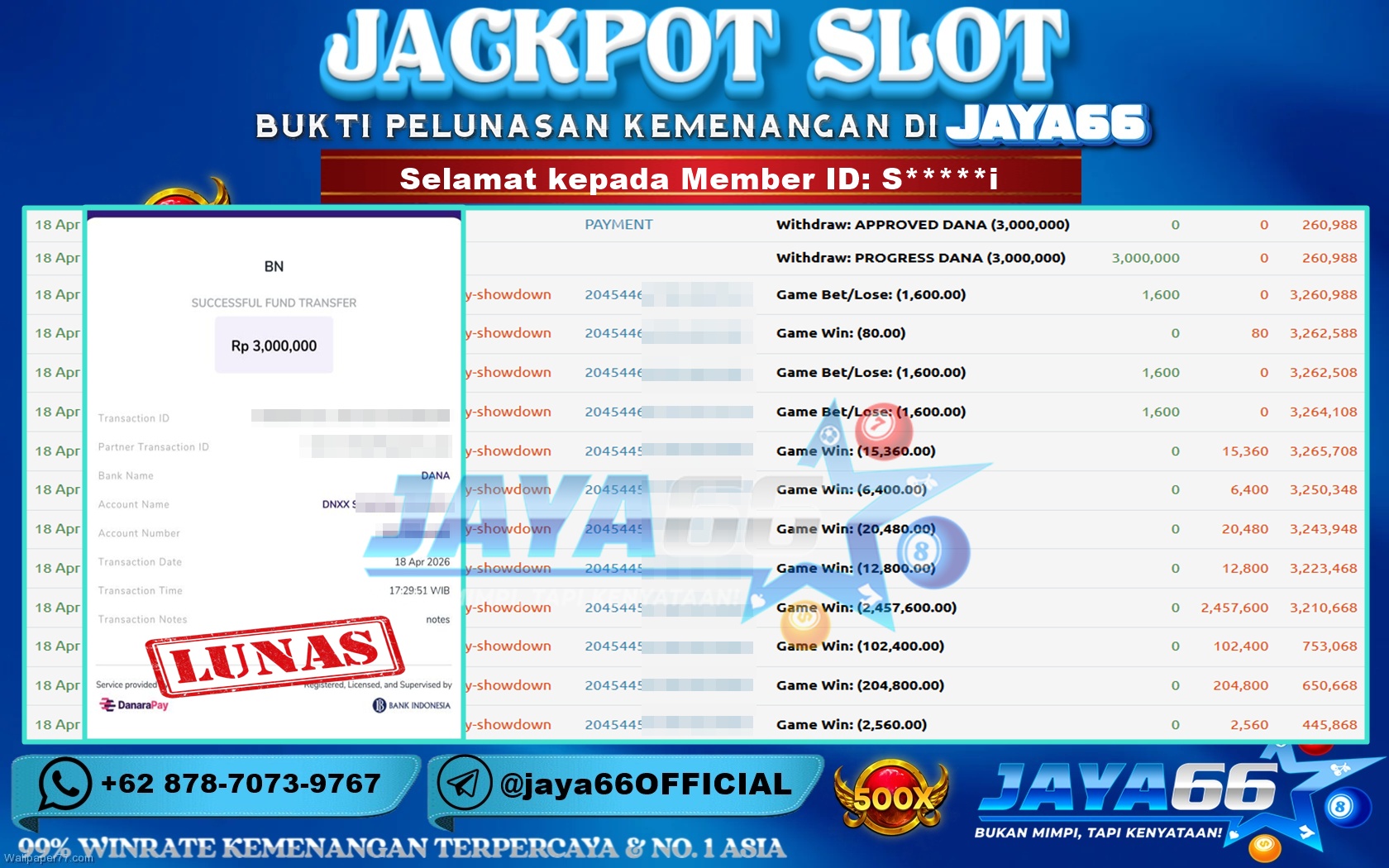 Selamat Kepada Member ID : S*****i Telah berhasil mendapatkan kemenangan besar pada permainan SLOT WILD BOUNTY SHOWDOWN , kemenangan Sebesar Rp. 3,000,000,- Setelah mengisi form withdraw dengan kurung waktu hanya 3 – 5 menit pihak JAYA66 sudah melakukan transfer kepada pemilik Userid dan dana sudah dapat di cairkan oleh pemenang. Bukti pembayaran yang kami berikan merupakan bukti pembayaran yang SAH / VALID yang langung di dapatkan melaui tanda transfer transaksi dari Bank yang di tuju.